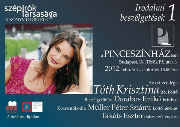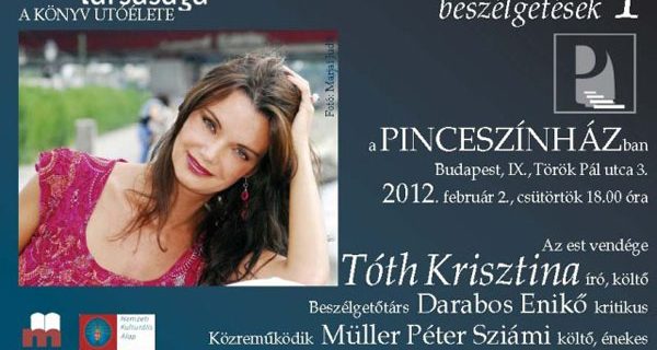A Szépírók Társasága A könyv utóélete elnevezésű irodalmi beszélgetés-sorozatot indít, amelynek első vendége Tóth Krisztina író, költő lesz a Pinceszínházban február 2-án. Beszélgetőpartnerként és zenei közbeszólóként Müller Péter Sziámi és Takáts Eszter vesznek részt az esten.