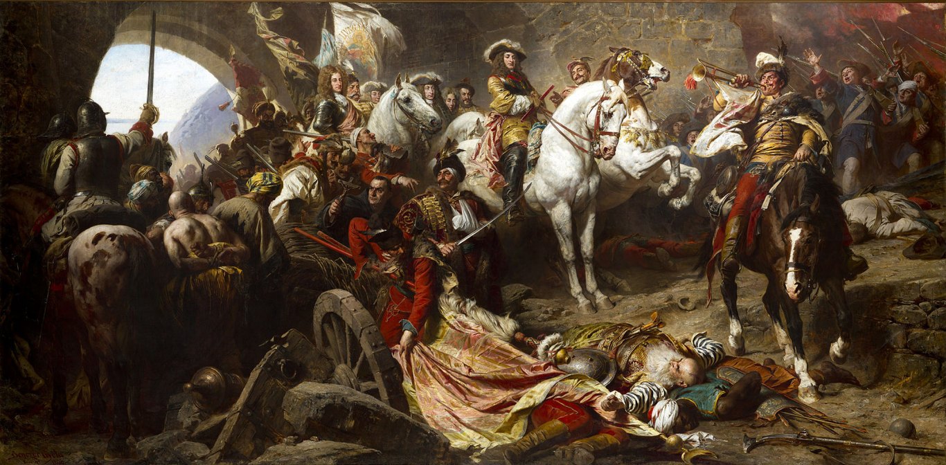 A képen: A lovon Lotaringiai Károly herceg, karddal a kezében a sebesült Petneházy Dávid hajdúkapitány, továbbá Bercsényi Miklós, Pálffy János, Savoyai Jenő, Bottyán János, és a lábuk előtt a legyőzött török vezér, Abdurrahmán Abdi pasa.