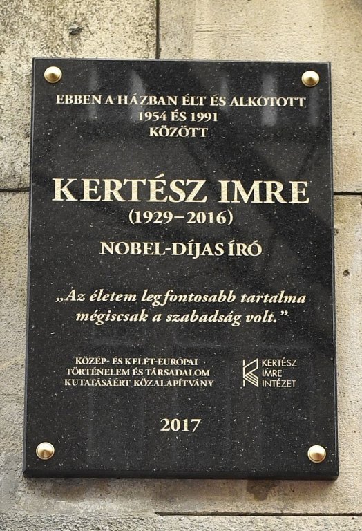 Emléktáblát avattak Kertész Imre (1929-2016) irodalmi Nobel-, Kossuth-, Herder- és József Attila-díjas magyar író, a Magyar Szent István Rend birtokosa születésének 88. évfordulója alkalmából egykori lakóháza falán, a II. kerületi Török utca 3. szám alatt csütörtökön, Budapesten.