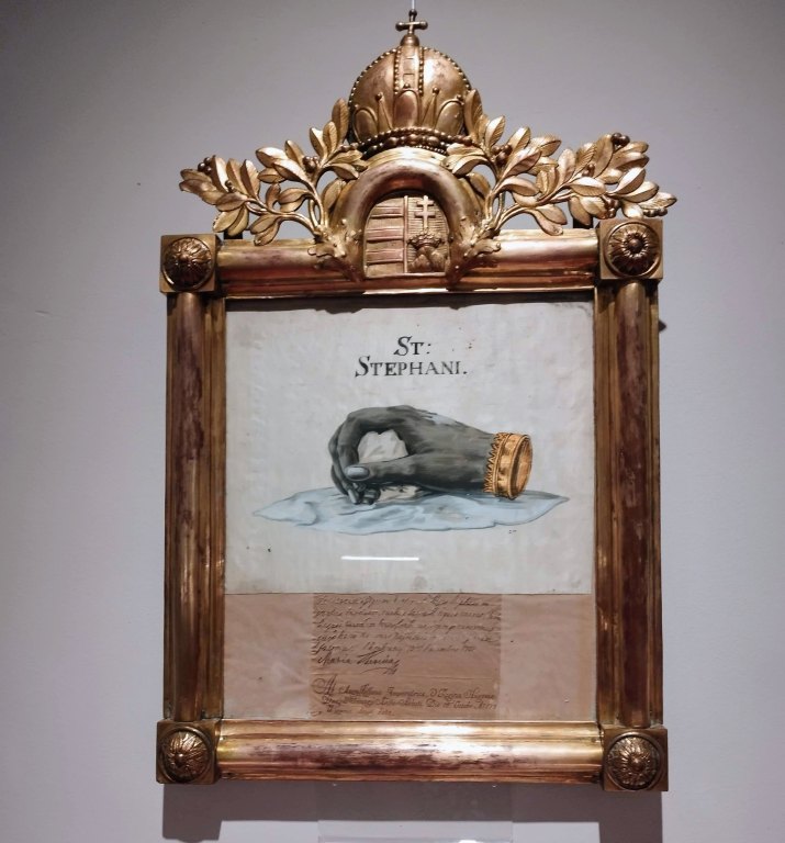 A Mária Terézia királynő személyéhez köthető festett Szent Jobb-ábrázolás arra a selyemkendőre készült, amely Szent István jobbját takarta, amikor az 1771-ben uralkodói közbenjárásra visszaérkezett Raguzából Magyarországra. A római katolikus egyház ezért érintéses ereklyeként tekint az uralkodónő autográf ereklyeigazoló és adományozó szövegével ellátott műtárgyra.