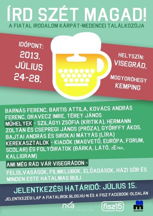 Kovács András Ferenc, Térey János, Oravecz Imre, Bartis Attila, Barnás Ferenc – A 15 éves Fiatal Írók Szövetsége ebben az évben is megrendezi nyári táborát július 24. és 28. között. A tavalyihoz hasonlóan ebben az évben is Visegrád a helyszín.