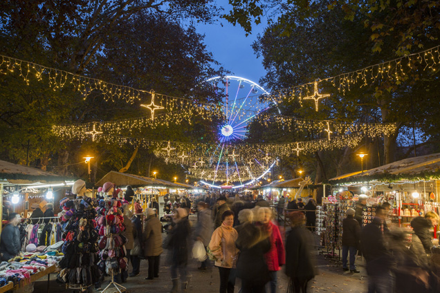 Tíz emelet magas, 144 férőhelyes óriáskerék a szegedi Széchenyi téren 2018. november 23-án. Az advent idejére épült látványosság mellett szalmalabirintus, fényfestés és szabadtéri jégpálya is várja az ünnepekre készülődőket a Tisza-parti városban.