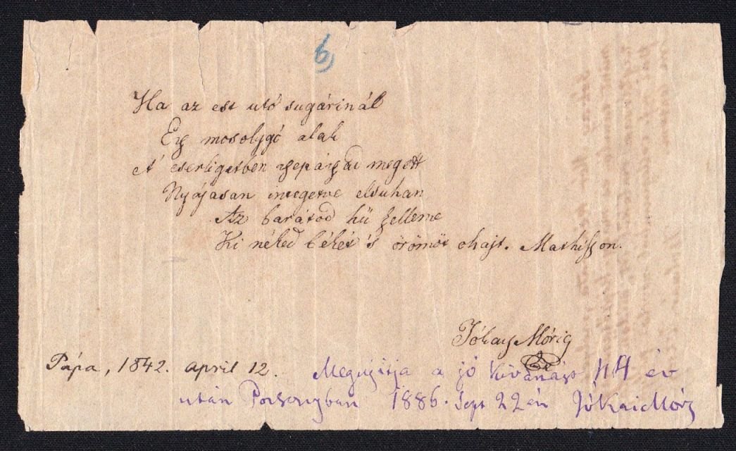 Mint megtudtuk, az aukció egyik tétele a 17 éves Jókai Mór versfordításának kézirata lesz, melyet a későbbi író iskolatársának ajánlott Jókay Móric aláírással, s amit 44 évvel később mint Jókai Mór erősített meg.