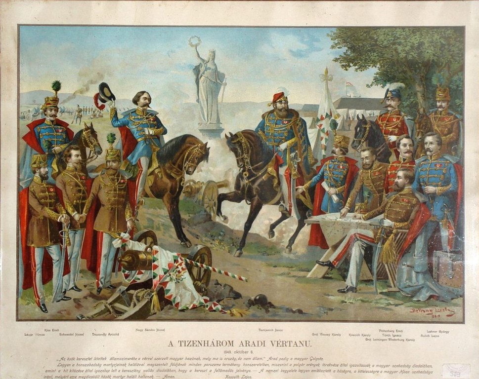 A nemzet vértanúja lett: Aulich Lajos, Damjanich János, Dessewffy Arisztid, Kiss Ernő, Knézich Károly, Lahner György, Lázár Vilmos ezredes, Leiningen-Westerburg Károly, Nagysándor József, Pöltenberg Ernő, Schweidel József, Török Ignác és Vécsey Károly.