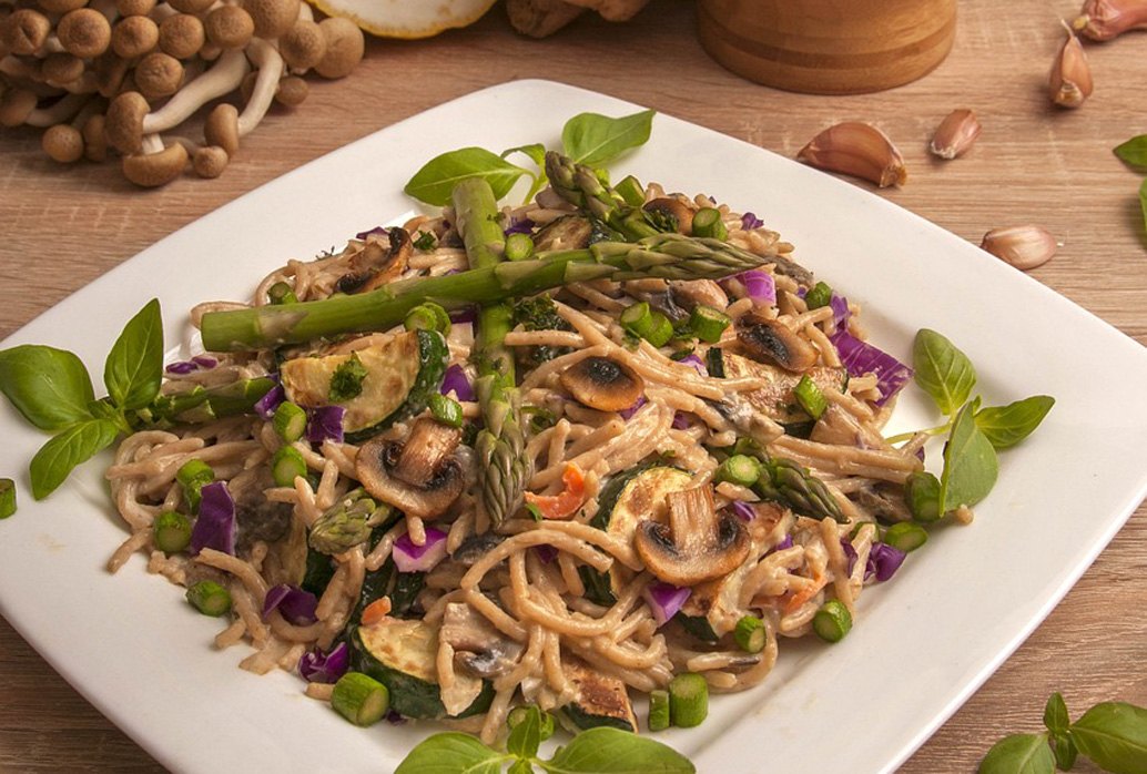 Hozzávalók: 1 csomag spárga. 150 ml tejszín, 2 gerezd fokhagyma megpucolva, gomba, egészben, 50 g parmezán (vagy növényi változata), a fele lereszelve, a fele vékonyan felvágva, 250 g metélt tészta