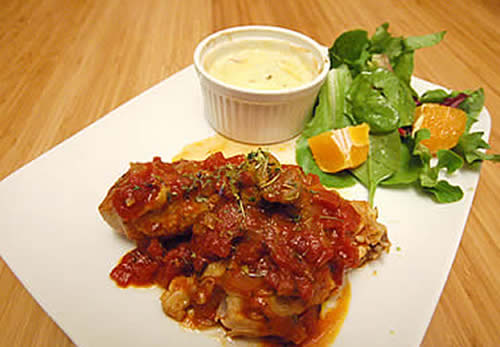 Hozzávalók: 1 db csirke, só, 6 db kisebb paradicsom, 1 db kisebb cukkini, 1 fej vöröshagyma, 1 fej fokhagyma, 2 szál kakukkfű, 22 szál rozmaring, 0,7 dl olívaolaj, 1 dl fehérbor, 2 db babérlevél, 4 dkg zöld olajbogyó, őrölt bors, 15 dkg paradicsompüré