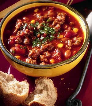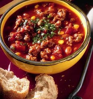 Hozzávalók: 40 dkg darált marhahús, 15 dkg füstölt szalonna, 1 közepes vöröshagyma, 50 dkg tarkabab, 15 dkg paradicsompüré, 5 dkg reszelt sajt, 3 kávéskanálnyi csípős paprika, bors, só