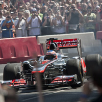 „Kissé szokatlan volt a pálya, de ez természetes, hiszen nem Forma-1-es versenyre épült” – mondta az első „kör” teljesítése után a 2009-es F1-es világbajnok, aki a belvárosban, a Bazilika és a Parlament között kialakított, 1,7 km hosszú pályán repesztett végig az istálló tavalyi, MP4-26-os jelzésű gépével.