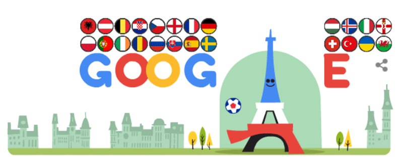 A Google keresőoldalon ezúttal az Európa-bajnoksággal kapcsolatos animáció látható. A doodle képre kattitva egy sor online hír jelenik meg a labdarúgó Eb-ről.