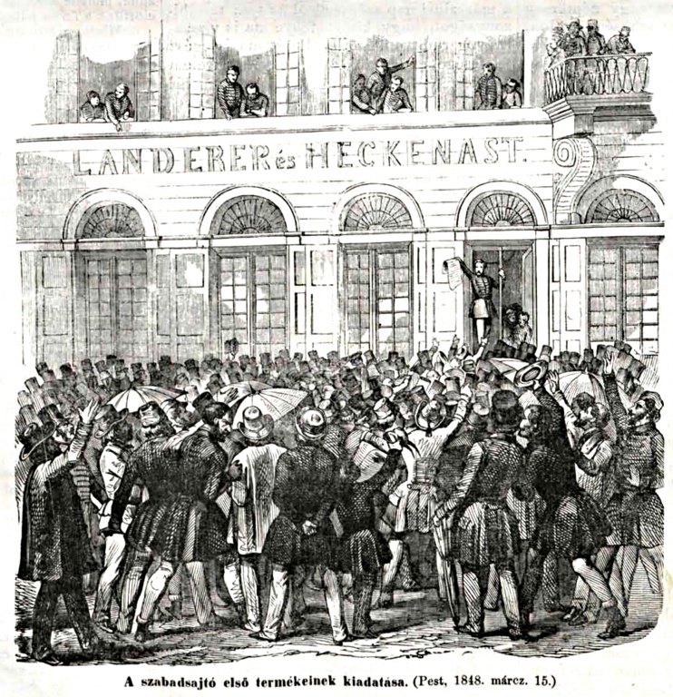 1848 márciusában az üzlettársak már értesültek Petőfiék terveiről, Landerer 14-én papírt készíttetett elő s meghagyta munkásainak, hogy pontosan, gondosan dolgozzanak. Másnap, amikor a tömeg élén érkező márciusi ifjak a 12 pont és a Nemzeti dal kinyomtatását követelték, Landerer „engedett az erőszaknak”, sőt súgva maga is segítette a szabad sajtó első termékeinek létrejöttét.