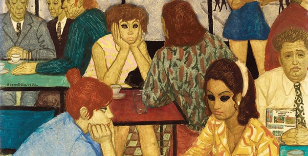 A csábítás fegyvere című kiállítás utolsó terme igazi meglepetés: a kamaratárlatnak beillő válogatás Czene Béla művészetéből ad ízelítőt. Az 1945 utáni évtizedekben nem akadt olyan magyar festő, aki nála intenzívebben reagált volna kora öltözködési divatjára. Pesti presszóban című képe azonban nem csak ebből a szempontból érdekes. A képen feltűnő alakok ugyanis szinte valamennyien konkrét, beazonosítható személyek. (És most nem a Mézga család Krisztájára gondolok a kompozíció közepén.) A korabeli művészeti kánonból kitaszított, de sorsát jó adag humorral megélő Czene a kép jobb szélére festette az akkor 43 éves Németh Lajos művészettörténészt, aki bibliaként szorongatja Herbert Read A Concise History of Modern Painting című kötetét. Balra hátul három úr hajol össze egy csésze fekete fölött. Csak egyiküket, a kor híres, sőt hírhedt műkritikusát, Rózsa Gyulát sikerült eddig azonosítani.