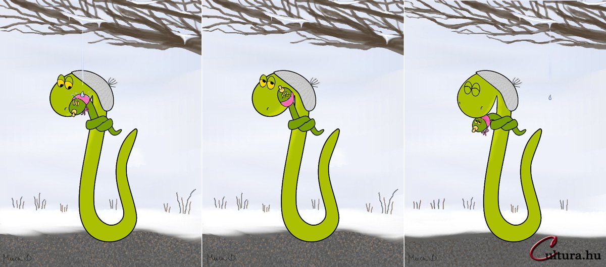Amint a hó olvadni kezdett, az enyhe időnek megörülve Byron elvitte sétálni Simone-t, aki rögtön rájött, hogy nem szereti, ha a fejére olvad a hó. Szerencsére a büszke nagybácsi orra alá bújva megmenekült a további csipegések-csöpögések elől… Hogyan sétál egy kígyó egy éppen-csak-kikelt csöppséggel, kiderül a mai, olvadós epizódból Mucsi Boglárka által.