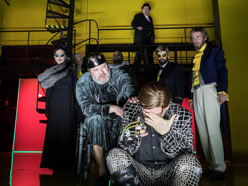 A nyomasztó sárga háttér, mely bármikor képes az aktuális lélektani vagy hatalmi helyzetnek megfelelően vörösbe, zöldbe, lilába fordulni, a szigorú csigalépcső és a vasnyi emelet (díszlet: Menczel Róbert), és Závada Péter irodalmi konzultánssága: mind kiváló háttérmuníció és nyelvi anyag a román rendező értelmezéséhez. A korabeli kosztümöktől természetesen elszakadunk, a színészek anakronisztikus jelmezekbe, kígyóbőr maskarába, bőrdzsekibe, öltönybe, kapucnis konfekciópólóba, hálós és áttetsző ruhába bújtak (jelmez: Nagy Fruzsina). Ebbe a térbe lopózik vízcseppek baljós ritmusára, vaksötétben a kígyómozgású, a lenézett Gloster Richárd (Alföldi Róbert), a manipulátorok manipulátora, amikor a nézőtér még javában sustorog. Erős felütés. Richárd alig észrevehetően púpos, észrevehetőbben sánta, lába-keze vasban, mégis magnetikus és karizmatikus tekintettel vázolja a világot romba döntő terveit (Alföldi alakítását ez az egyetlen gáncs érheti csupán, ti. hogy túl vonzó ahhoz, hogy undort keltsen). A testi fogyaték és a degenerált szellem végletesen, egymásból következőn fonódik benne össze, zseniális manipulátor, akinek egyszerre kenyere a látványos erőszak és a népkábítás. Megjárja a csúcsot és a poklot, perverz élvezettel színlel, taktikus és cinikus, amorális és patologikus, annyira képtelen az empátiára, hogy még saját magát se tudja megsajnálni. Hiába küzdi ki a vágyott hatalmat, hiába használja a (bér)gyilkosságot mint pofonegyszerű megoldást újra és újra, koronás főként már nem tud továbblépni. A jövőre nincsenek tervei, elgondolásai, s karrierje talán inkább életképtelensége, mintsem az ellene törő külső erők miatt törik derékba.
