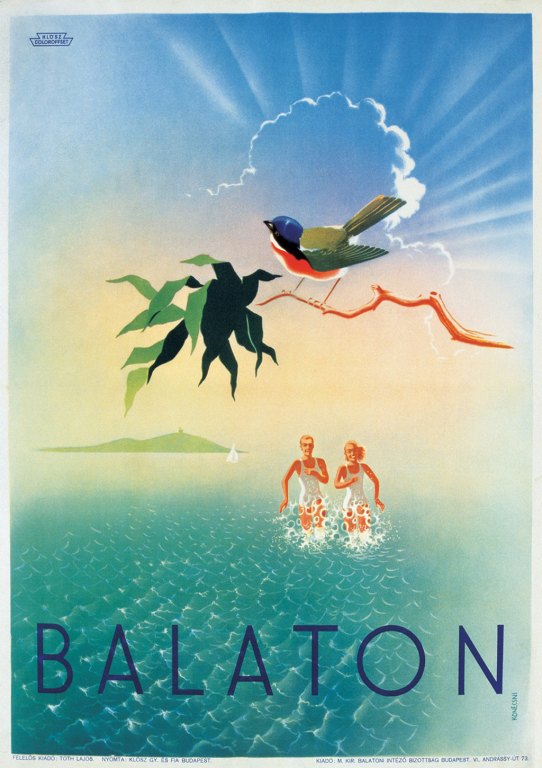 Budapest mellett sokat hirdették már az 1930-as években is a Balatont: a tó körül ekkora már pezsgő fürdőélet alakult ki. A Balaton plakátokon domináns elem a végtelenbe vesző jellegzetes színű víztükör, az északi part hegyei, és a jellegzetes parti növények, nádasok és nyárfák. A legtöbb plakáton önfeledten fürdőző alakokat, vagy a hullámokat szelő vitorlásokat látunk.