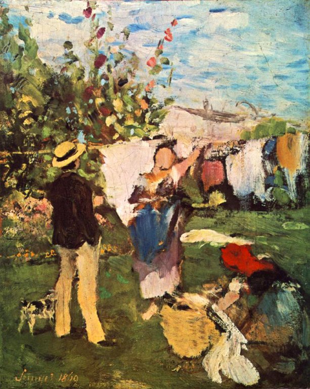 Szintén Münchenben, de nem az Akadémiai szellemben festette otthoni élményeiből táplálkozó, bravúrosan megoldott tanulmányát, a kertben, a nyári napfényben frissen mosott ruhát teregető mosónőket és az őket figyelő „téns úrfit”, azaz a Ruhaszárítás című festményt. (A kép Teregetés, Mosónők, Ténsúrfi címen is szerepelt.) Fő témája itt is – mint „A hinta” tanulmányon – a mindent színjelenséggé változtató tűző napfény; az akadémiai szabályokat elvető, a közvetlen optikai benyomást rögzítő laza kompozíciójával Szinyei itt is az impresszionizmus lényegét ragadta meg, bár a franciák hasonló törekvéseit nem ismerte, Párizsban nem járt, s csupán a müncheni nemzetközi kiállításon szereplő Gustave Courbet realista képeit és Edouard Manet egészen korai, még nem impresszionisztikus műveit látta. (Claude Monet első impresszionista képét a Grenouillére-ről ugyanebben az évben festette.)