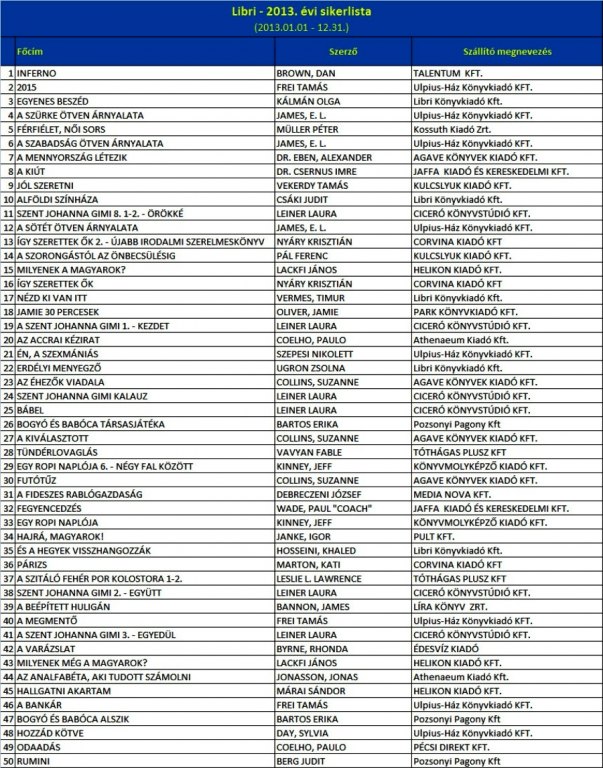 Bár csak ősszel érkezett meg, egyértelműen elfoglalta az első helyet Dan Brown várva várt új kötete, az Inferno. Négy év szünet után olvashatja ismét a világ közönsége az amerikai bestseller szerző írását, amelyben Robert Langdon professzor új kihívások elé néz. Az izgalmas, profi könyv, amelynek fordításai a legnagyobb titokban olaszországi bunkerekben elzárva történtek meg, hogy semmilyen információ ne szivároghasson ki előre, a nemzetközi publikum után természetesen a magyar olvasókat is elkápráztatta. Szintén várható volt, hogy Frei Tamás képzeletbeli utazása a magyar jövőbe, a 2015 szintén óriási népszerűségre tesz szert. A lista második helyén szerepel, de a legjobb 50 közé két korábbi Frei-könyv, A Megmentő és A Bankár is felkerült.