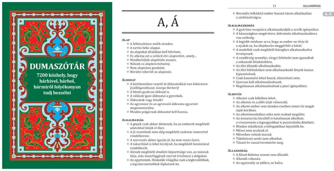 Egy apa sem tudja megmondani, hogy melyik gyerekére a legbüszkébb. De mint érdekességet, igen szeretem a Dumaszótárunkat, ami igazából egy új közhelyszótár. 7200 elcsépelt mondat található benne, amelyeket a társalgás soron sokszor előhúzhatunk, ha megakadtunk a mondandónkban.